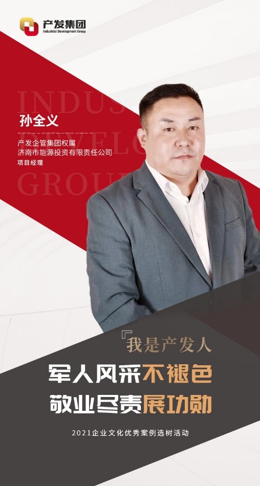 孫全義,現(xiàn)任產(chǎn)發(fā)企管集團(tuán)權(quán)屬濟(jì)南市能源投資有限責(zé)任公司(以下簡稱“能投公司”)項(xiàng)目經(jīng)理。2001年參軍,在部隊(duì)期間刻苦訓(xùn)練,聽黨指揮,服從命令。2003年他從部隊(duì)光榮退役,隨后加入能投公司。期間曾借調(diào)至濟(jì)南市發(fā)改委幫助工作,現(xiàn)負(fù)責(zé)能投公司的資產(chǎn)管理工作。