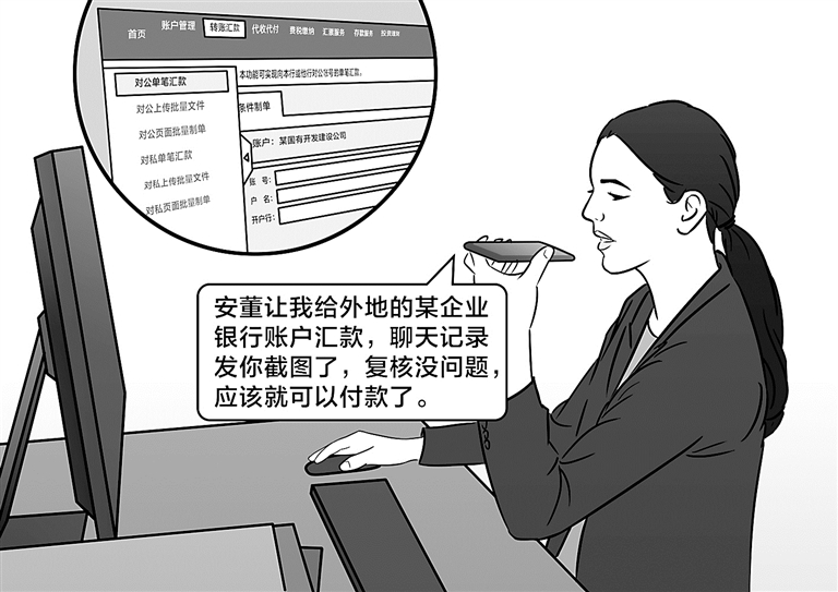 黃某某輕信上述信息,在未向董事長安某某當面或電話核實、且未見到任何書面審批手續(xù)的情況下,擅自向外地企業(yè)銀行賬戶發(fā)起、錄入網(wǎng)銀支付,并將聊天群內的截圖發(fā)送給該公司會計華某某(另案處理),要求其進行復核付款。