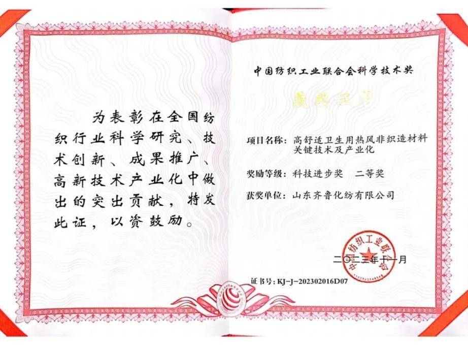 齊魯化纖集團(tuán)山東齊魯化紡有限公司 科創(chuàng)項目榮獲中國紡織工業(yè)聯(lián)合會科技進(jìn)步獎二等獎