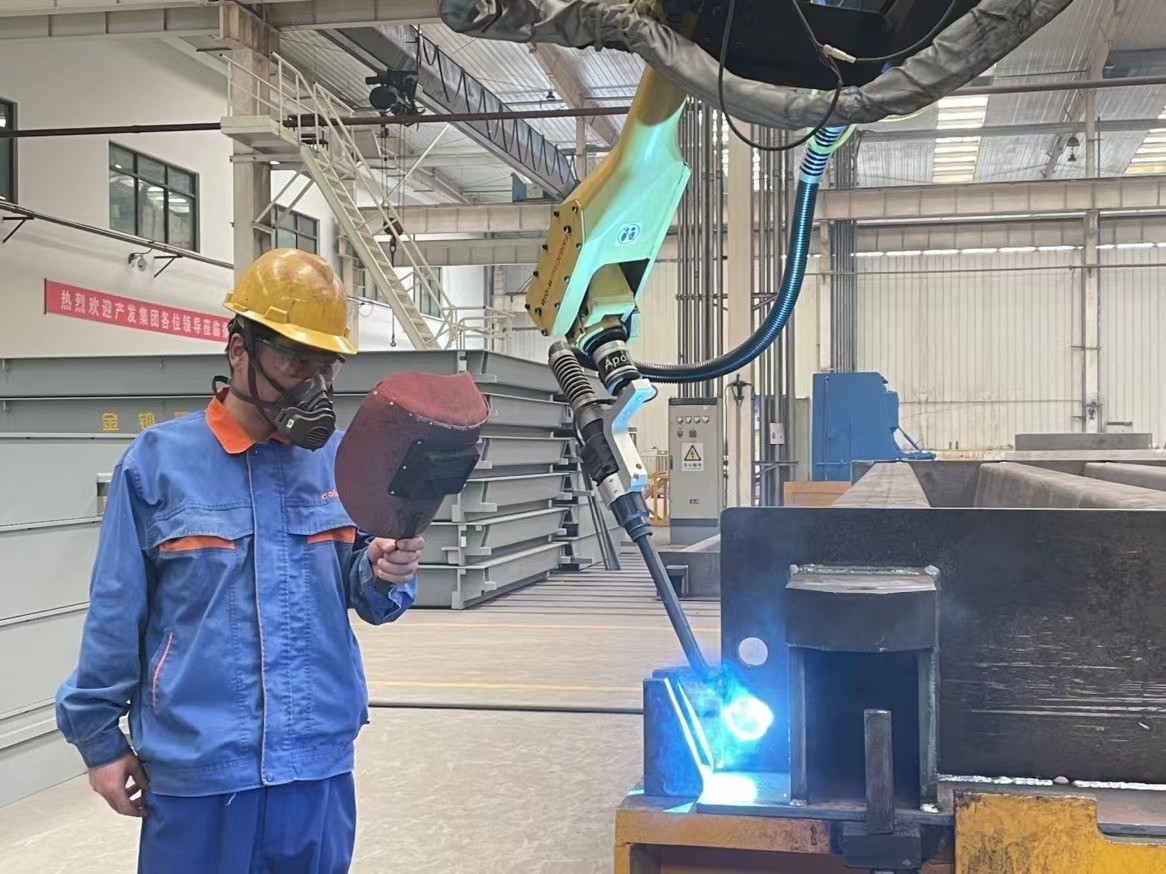 金鐘研發(fā)部門為提升汽車衡秤臺(tái)的承重強(qiáng)度,新設(shè)計(jì)了U型梁結(jié)構(gòu),經(jīng)過試制和不斷推廣,訂單逐步增加,汽車衡班的工作壓力也不斷加大,而汽車衡的稱臺(tái)焊接成為了制約工作效率的瓶頸。為了能夠按時(shí)保質(zhì)完成生產(chǎn)任務(wù),黨支部組織成立“黨員編程突擊隊(duì)”,由黨員張慶力任隊(duì)長(zhǎng),突擊隊(duì)成員發(fā)揮模范帶頭作用,發(fā)揚(yáng)匠心精神,成功解決了“汽車衡自動(dòng)化焊接編程”和自動(dòng)焊機(jī)在平臺(tái)底部尋位不準(zhǔn)難題,最大限度地提高焊接機(jī)器人的效率。